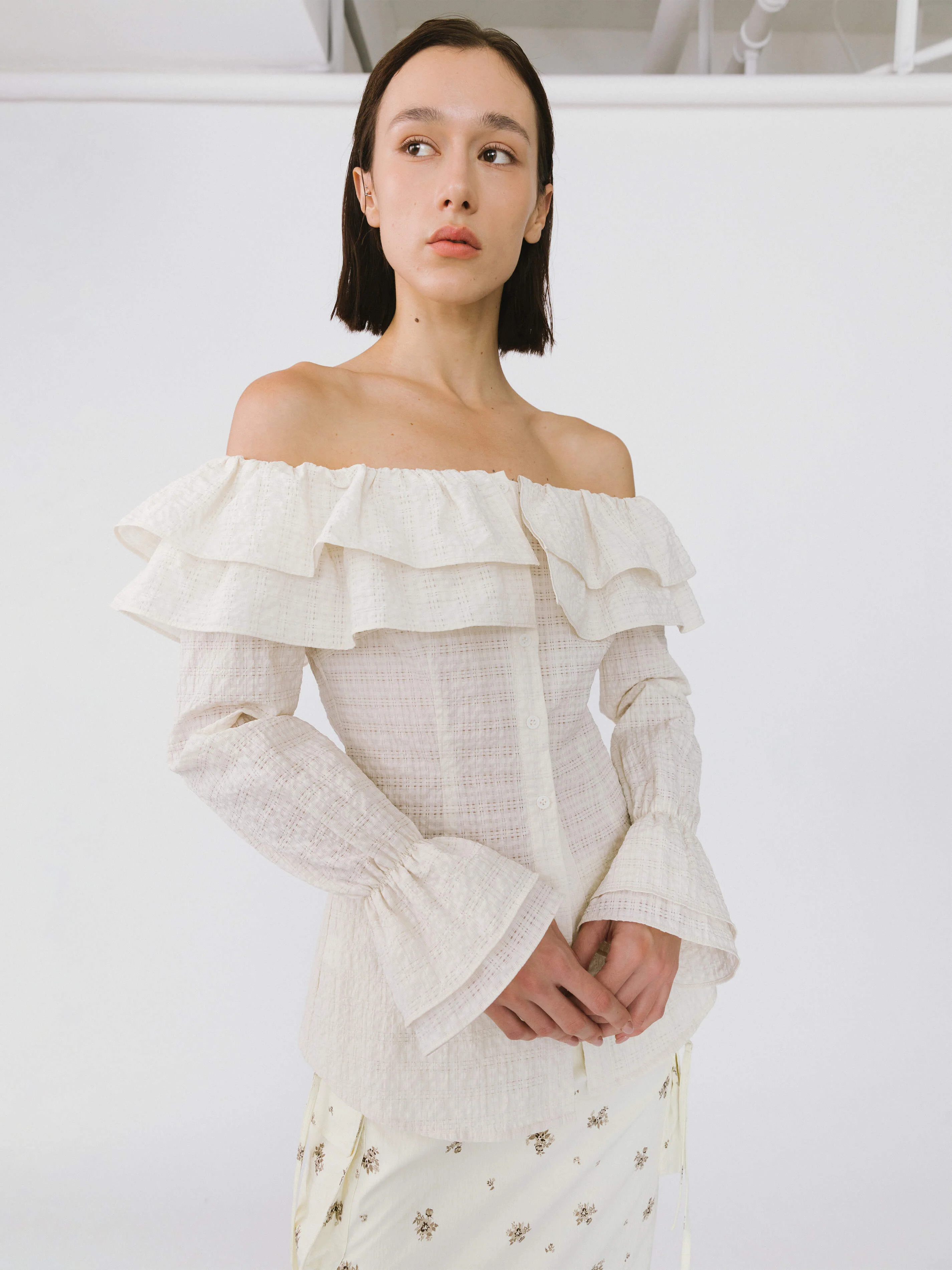 Tailored shirt, meticulously designed with a one-shoulder neckline and double-layered ruffle detailing along the collar. The slim fit silhouette and solid-coloured fabric exude sophistication, while the flared cuffs add a touch of elegance. The fabric composition is 100% Polyester. Model wears size S, which is suitable for UK size 8-10. Product Code: COBDB1001