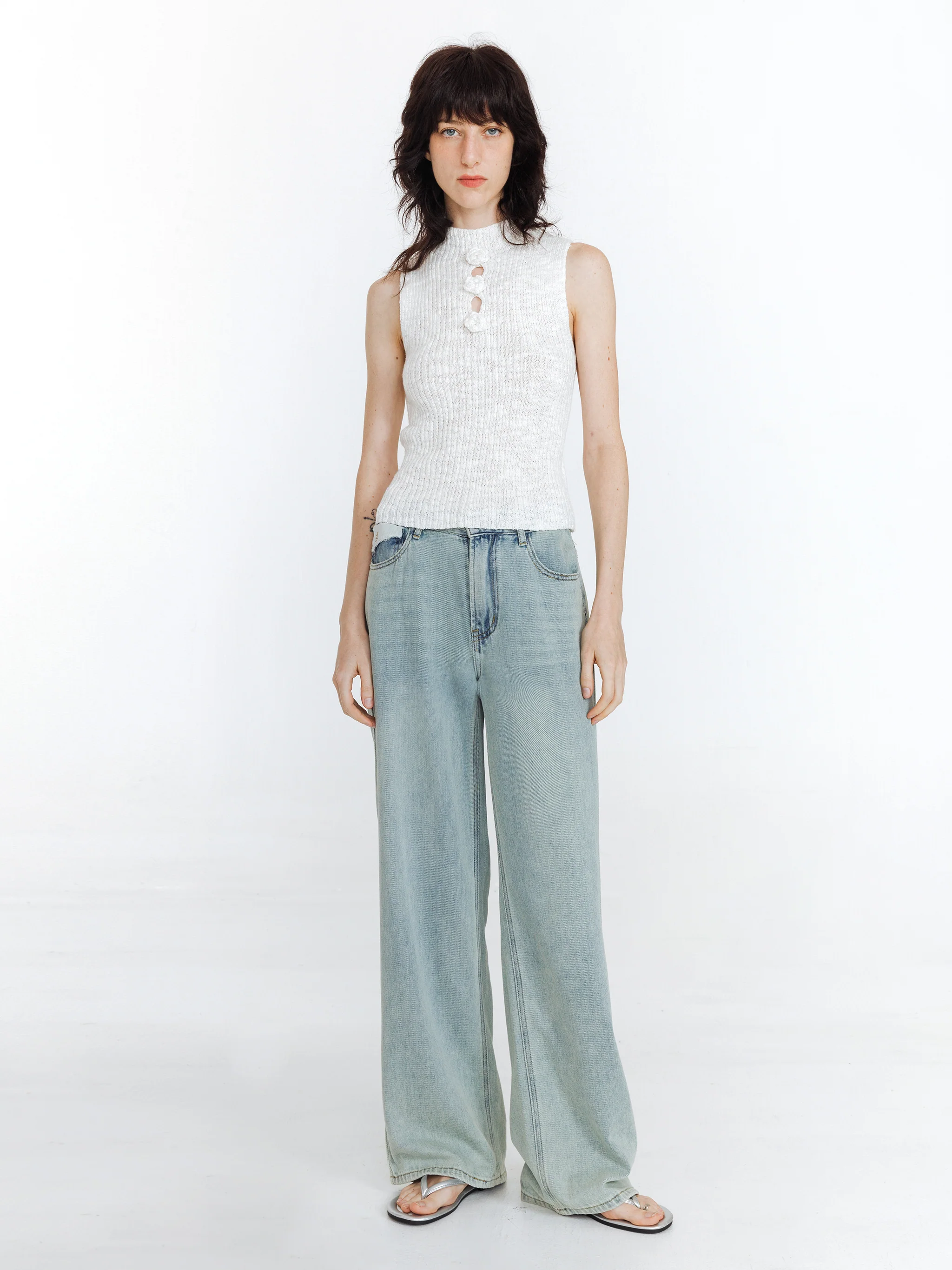 The Sleeveless knit vest featuring a mock neck and a chic design. Delicately crafted with a hollow pattern above the chest and adorned with 3D knitted flowers, this vest offers a blend of sophistication and elegance. Perfect for layering or wearing alone, it adds a touch of feminine charm to any ensemble. The fabric composition is 67% cotton 33% polyester. Model wears size UN, which is suitable for UK size 8-12. Product Code: COBDK5004