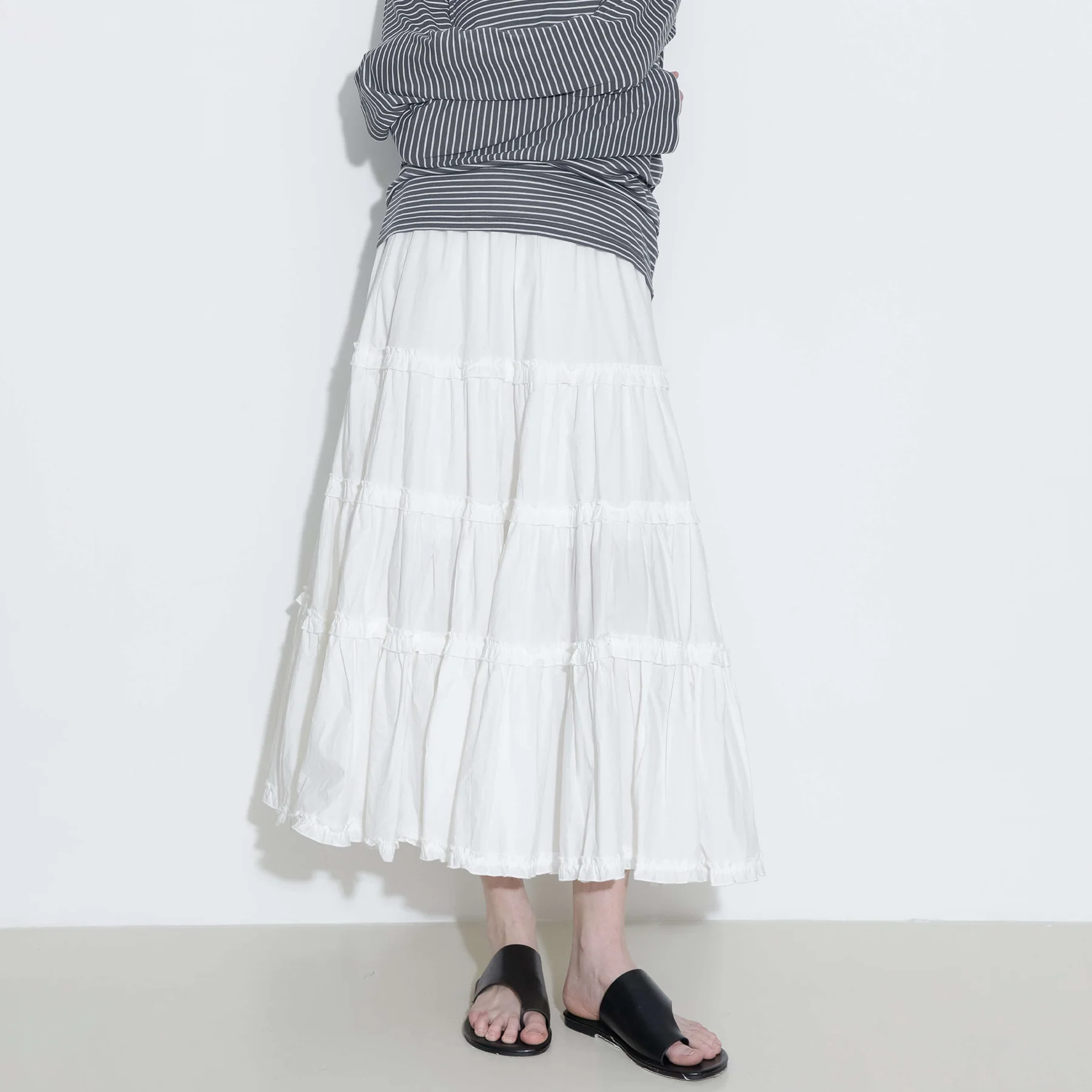 White cake-skirt, featuring a flattering A-line silhouette and delicate tiered ruffle trim. Designed with a stretchy waistband for comfort and versatility, this skirt effortlessly combines elegance with ease of wear. The fabri composition is 100%cotton. Model wears size UN, which is suitable for UK size 8-12. Product Code: COBDS5005?