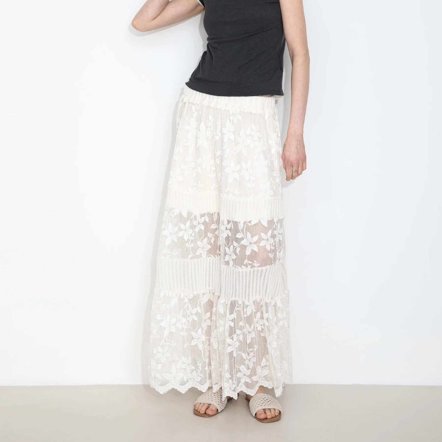 The lace midi skirt featuring a blend of lightweight, textured lace and knit fabric. The A-line silhouette and scalloped hem create a flattering, feminine shape. The skin-soft knit lining ensures comfort, making this skirt both elegant and comfortable for any occasion. The fabric composition is 100% polyester, with a 96.5% polyester 3.5% spandex ingredient lining. Model wears size UN, which is suitable for UK size 8-12. Product Code: COBDS6010