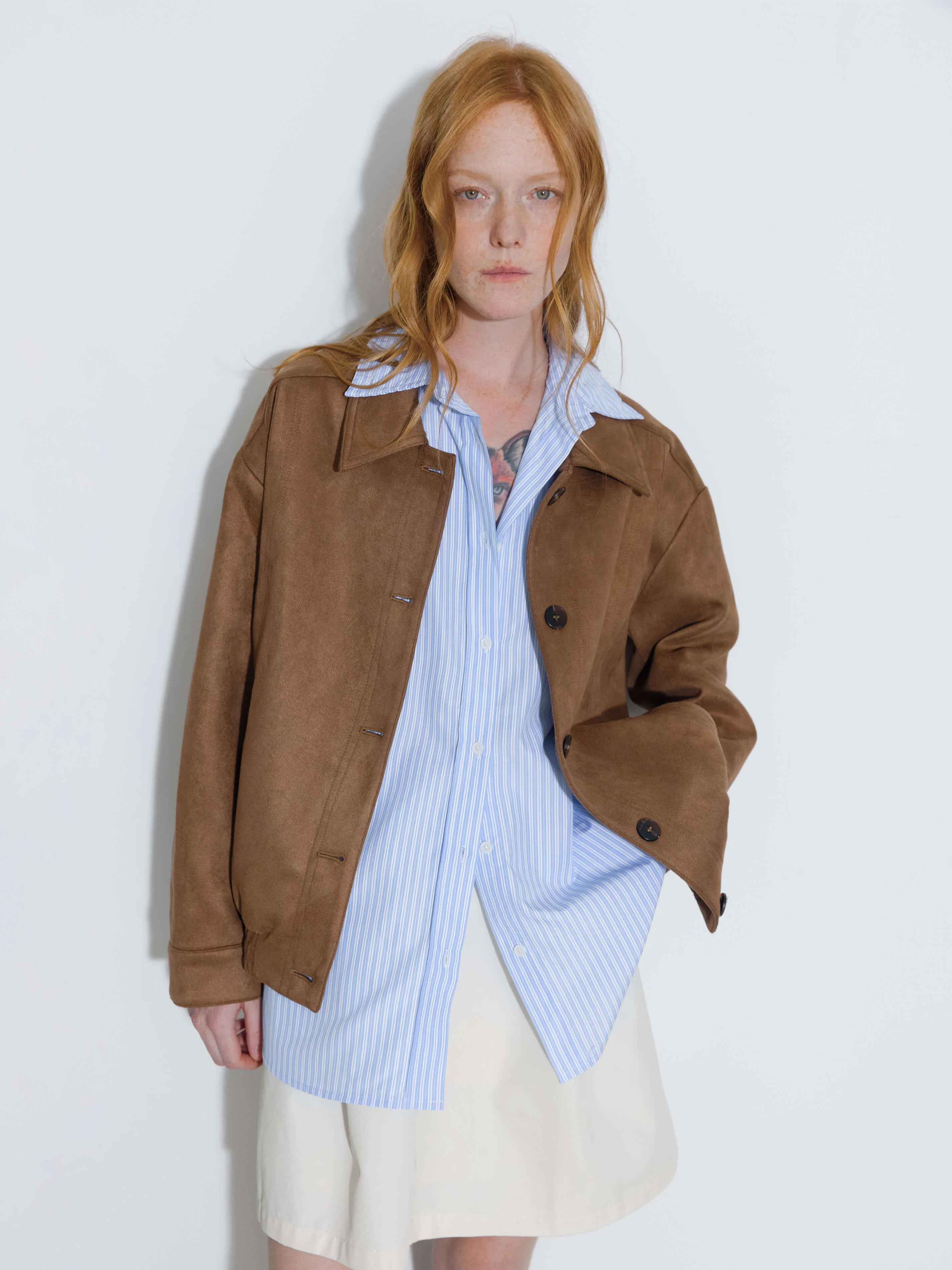 Suede jacket in sienna from ONE BY CUBIC collection. Straight-cut model with elastic hemline. Shirt collor and long sleeves. Front logo buttons fastening. Two side pockets. The fabric composition is 95% Polyester 5% Spandex, with a 100% Polyester lining. Model wears size UN, which is suitable for UK size 8-12. Product Code: TOBDC6204