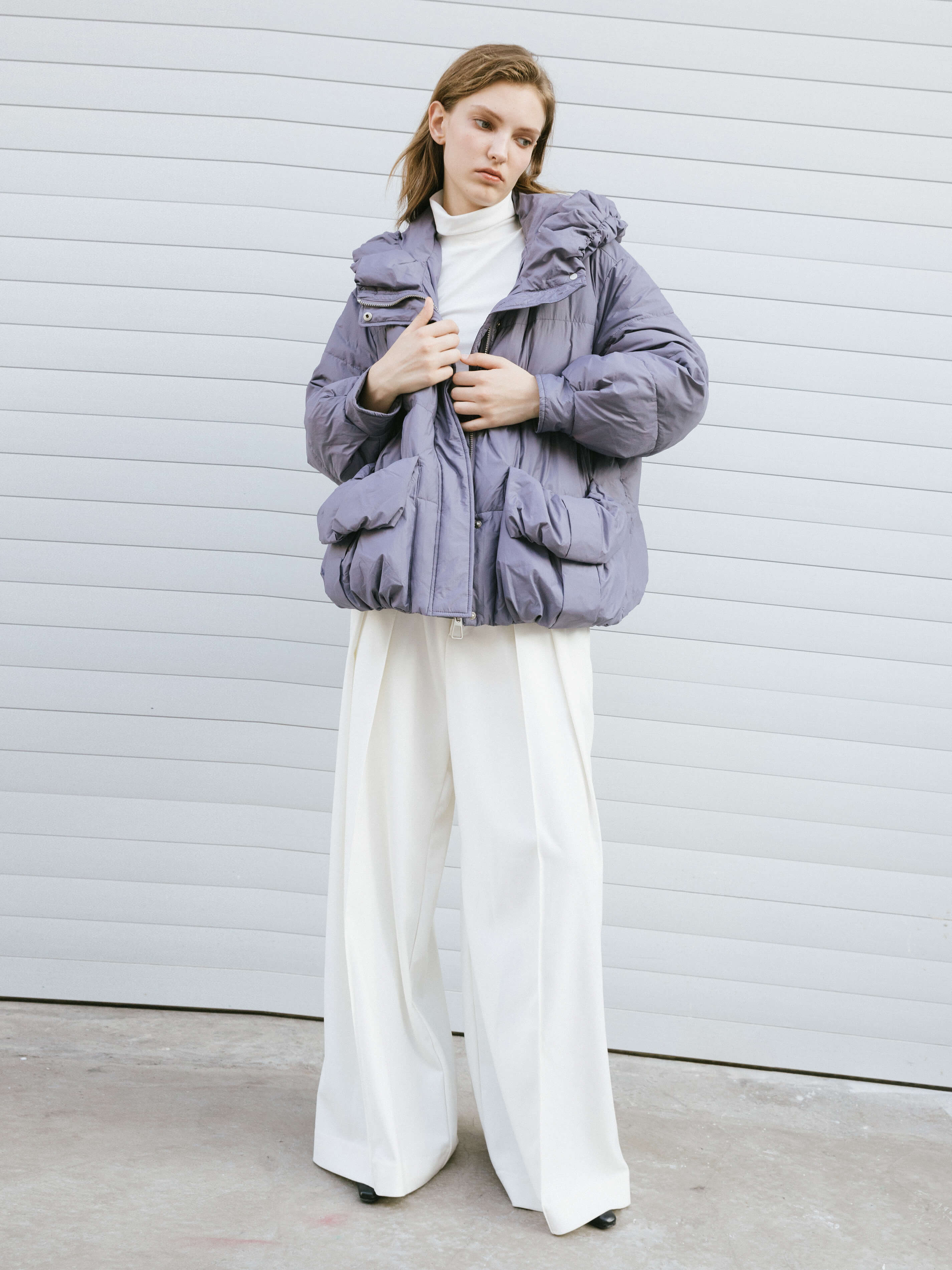 Short puffer jacket in purple/khaki. Gathered effect in hood and pockets. Large flap front pockets. High neck design. Invisible button stand. Zip and popper fastening. Super dropped shoulder with oversized fit. The fabric composition is 100% Chinlon,with a 100% Polyester Lining and White Duck Down(90%)/(G)200 Filling. Model wears size UN, which is suitable for UK size 8-12. Product Code: COBBC6051
