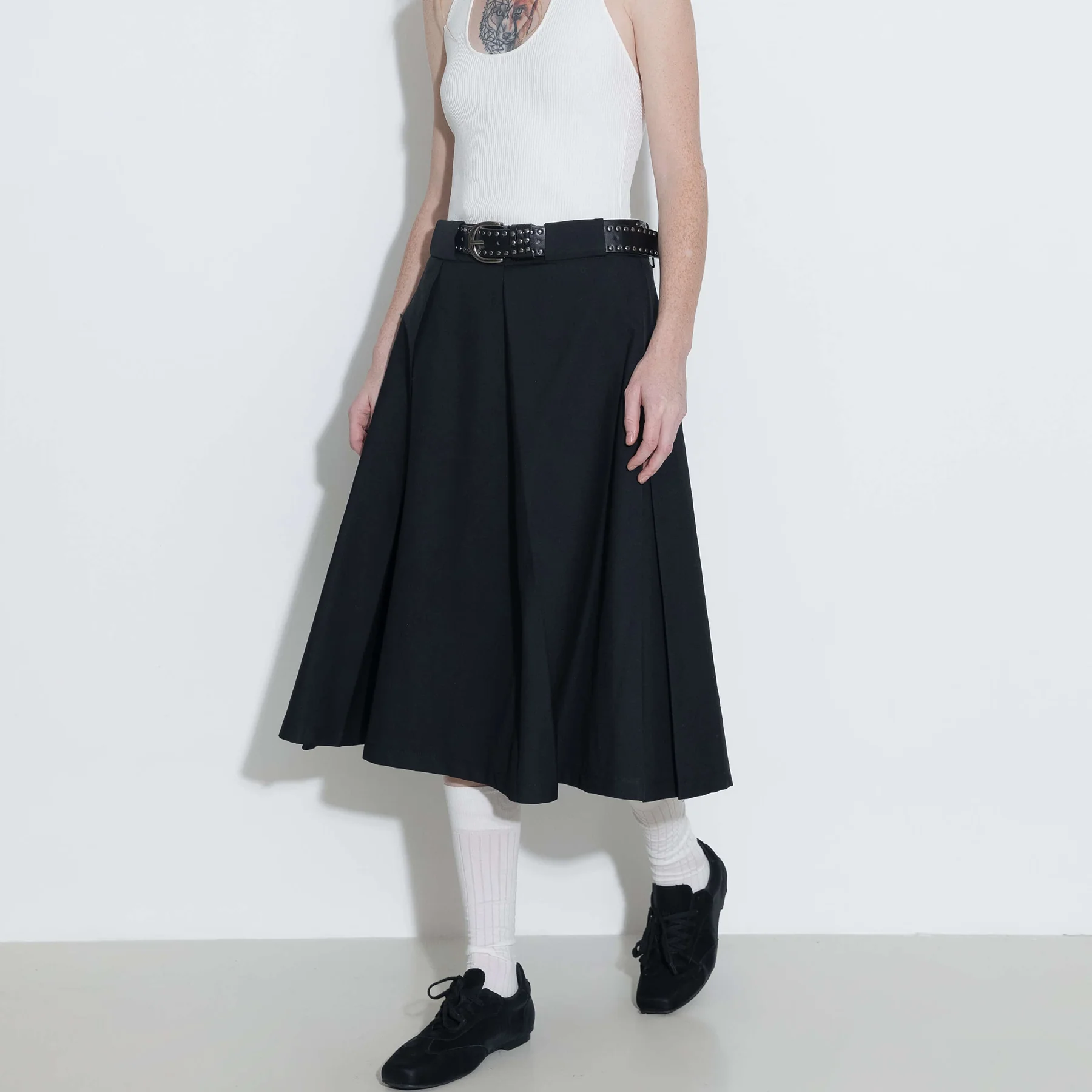 High waisted a-line midi pleated skirt in black/gray. This midi skirt features a flattering high-waisted design with a classic A-line shape. The pleated detailing adds movement, while the tailored style ensures a refined and polished look.?The fabric composition is 78.4%Polyester 21.6%Viscose, with a 100% Polyester Lining. Model wears size L, which is suitable for UK size 12. Product Code: COBCS5003