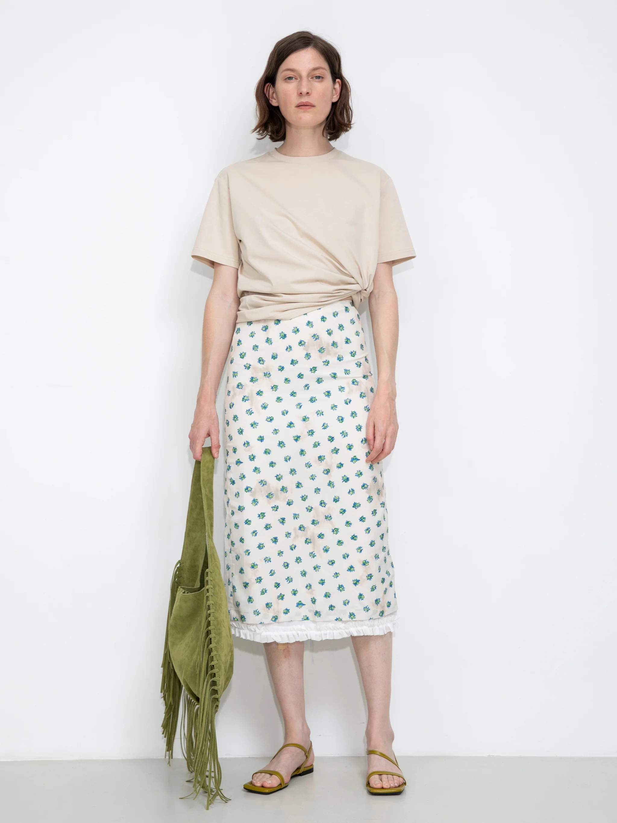 The pencil skirt featuring a polka dot printed fabric with a light purple pattern. Designed with a straight silhouette, it includes a back slit and a lace-trimmed hem.? The fabric composition is 100%Polyester. Model wears size S, which is suitable for UK size 8. Product Code: COBDS5012