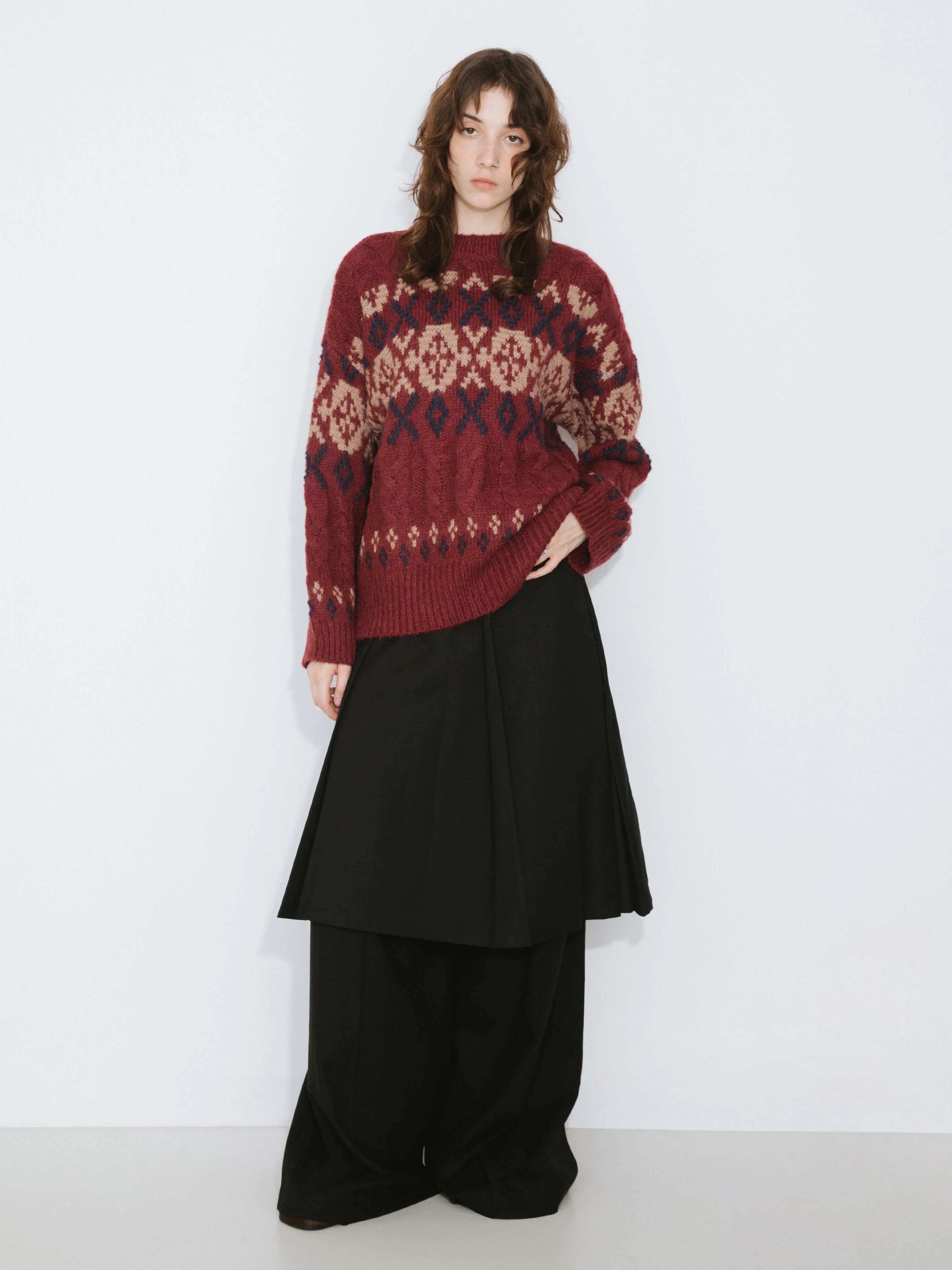 Short sweater in darkred with wool blend. Boxy cut with crew neck, long straight sleeves, and ribbed knit in hemline and cuffs. The fabric composition is 45% Nylon 35% Acrylic 20% Wool. Model wears size UN, which is suitable for UK size 8-12. Product Code: COBDK6013
