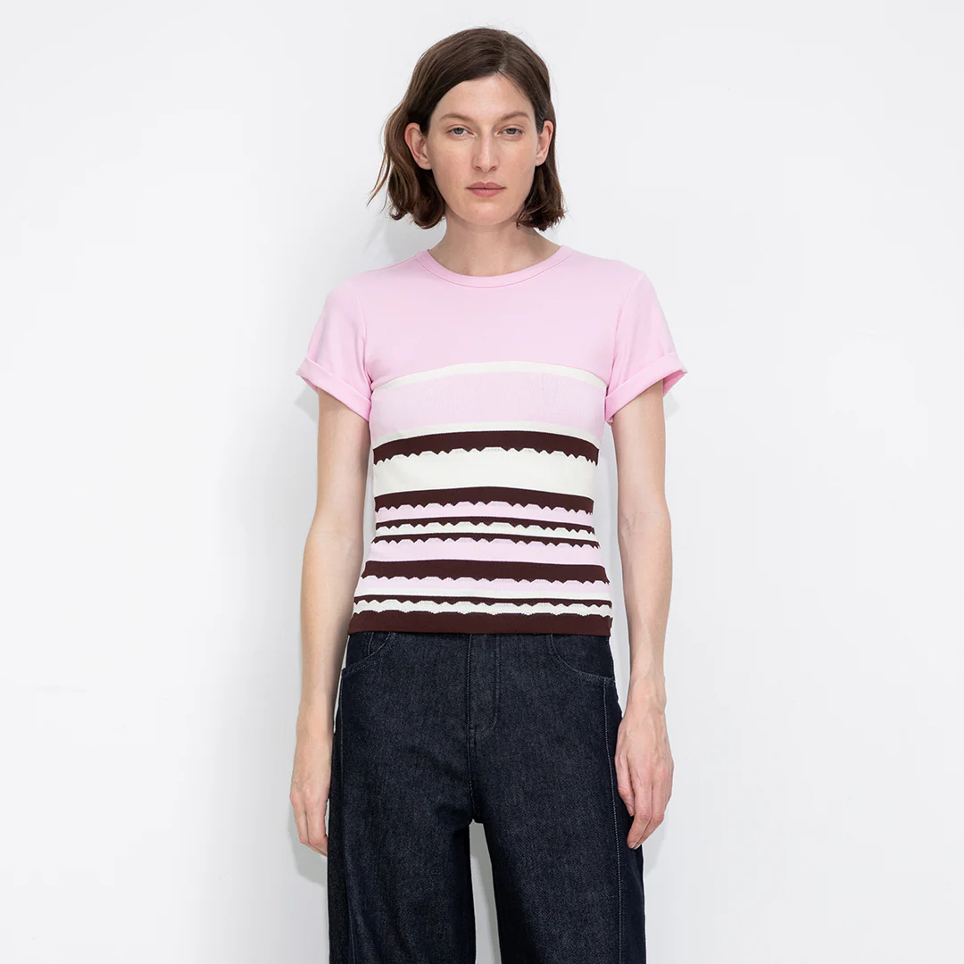 Introducing our T-shirt crafted from premium pure cotton fabric, featuring an irregular stripe color-block design. With meticulous attention to detail, it combines stripe patterns with knit patches seamlessly. The tailored fit ensures a flattering silhouette. The fabric composition is 100% cotton, with a 65% viscose 35% nylon patchwork fabric. Model wears size S, which is suitable for UK size 8. Product Code: COBDT5003