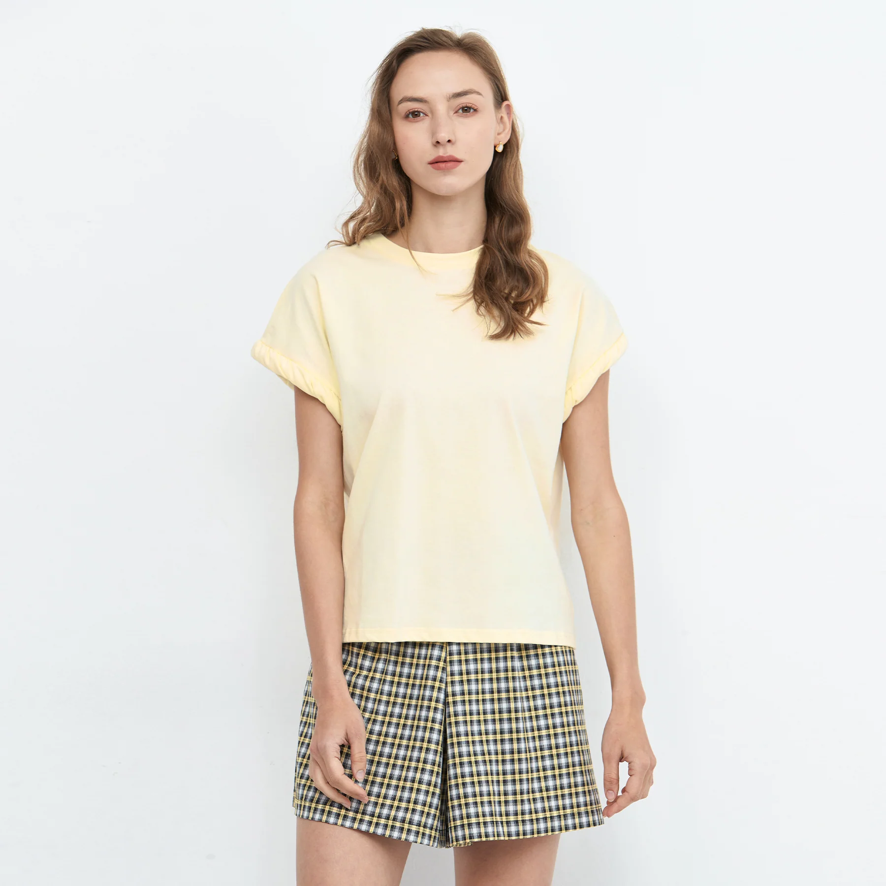The T-shirt crafted from high-quality pure cotton fabric, designed for breathability and comfort. It features a relaxed fit, a classic round neckline with ribbed detailing, rolled sleeves for a casual look, and a waist cinch for a flattering silhouette. The fabric composition is 100% cotton. Model wears size UN, which is suitable for UK size 8-12. Product Code: COBAT5025