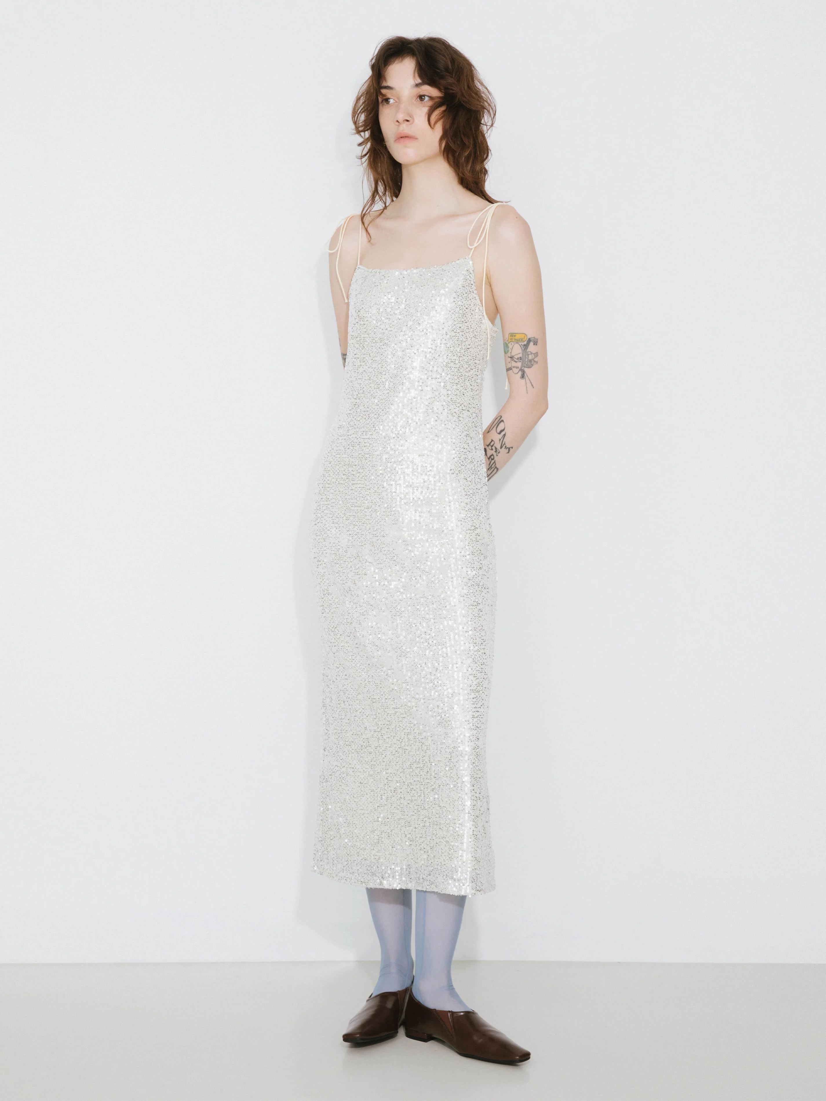 Long slim fit dress in white with sequin fabric. Suspender strap design.?The fabric composition is 100% Polyester, with a 100% Polyester Lining. Model wears unique size M, which is suitable for UK size 10. Product Code: COBCD6009