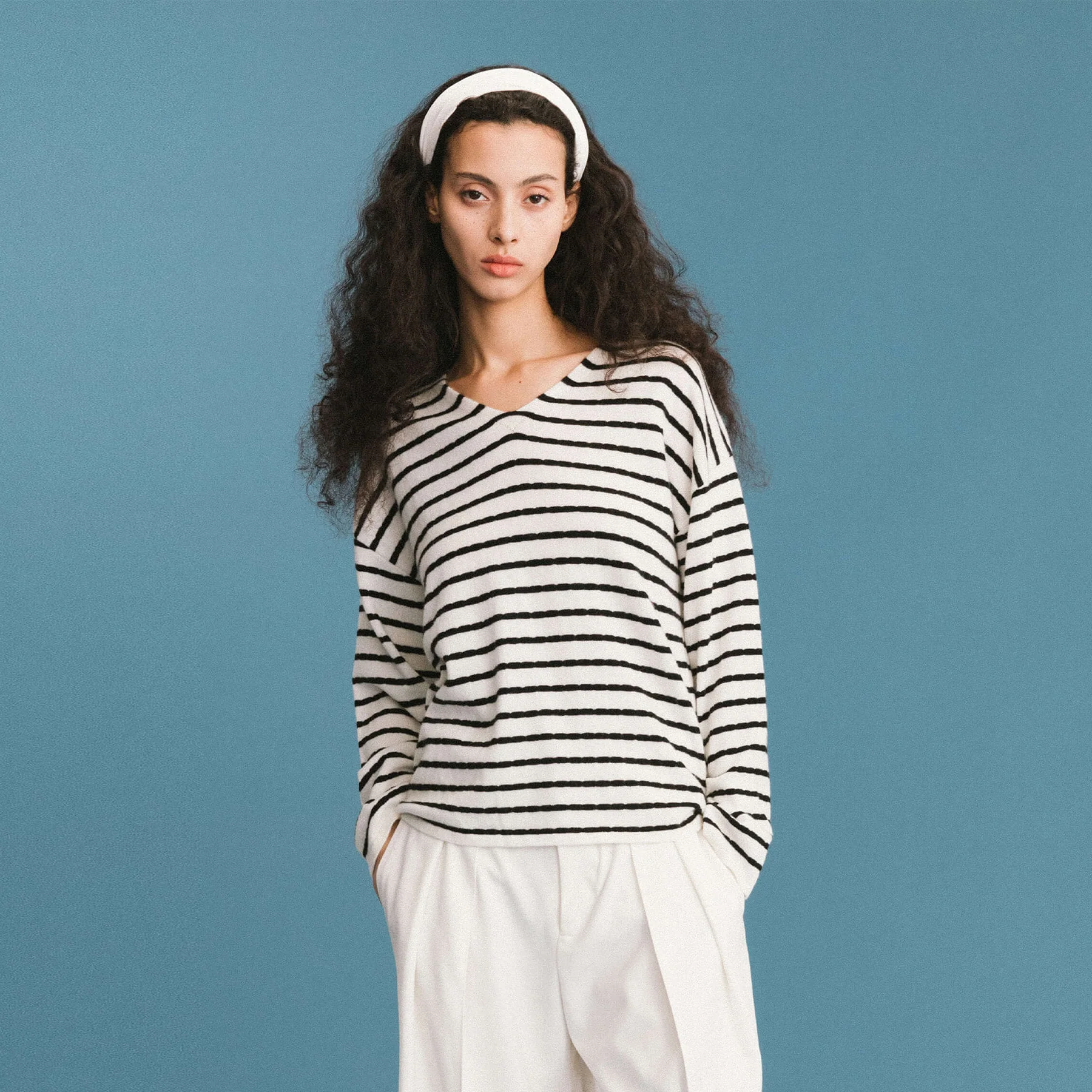 Wool and cashmere knitted jumper in balck and white strips from ONE BY CUBIC collection. Boxy model with V-neck. long sleeves with dropped shoulder. The fabric composition is 67.7% Sheep Wool 32.3% Cashmere. Model wears size UN, which is suitable for UK size 8-12. Product Code: TOBDK6203