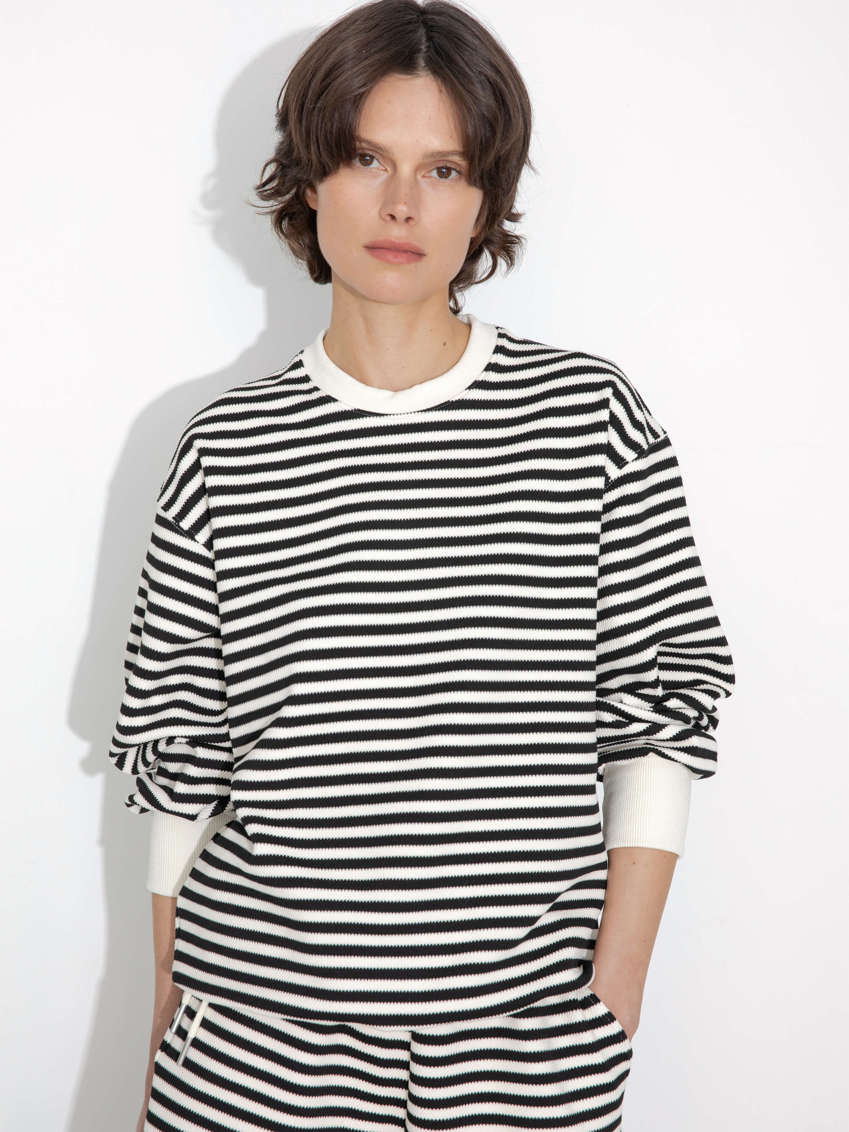 Sweatshirt and shorts set in black and white stripes from ONE BY CUBIC collection. Oversize model with contrast crew neck. Dropped shoulder and long sleeves with wide ribbed cuffs. Elastic waist shorts with sling and side pockets. The fabric composition is 79% polyester, 20% viscose, 1% spandex. Model wears size UN, which is suitable for UK size 8-12. Product Code: TOBDW6201